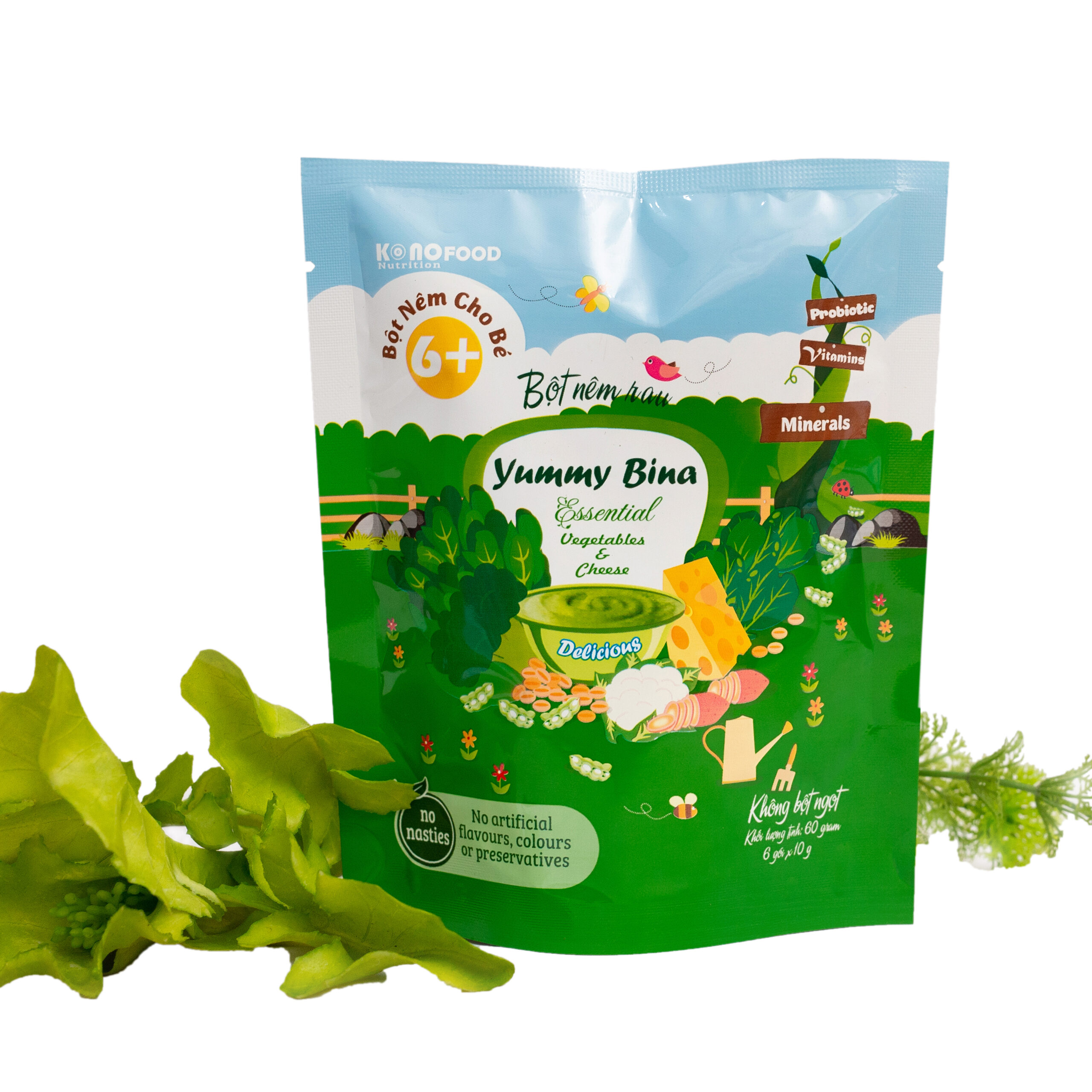 Dòng 6+: phù hợp cho các bé từ 6 tháng tuổi ăn dặm. Sản phẩm không chứa muối, chứa đến 90 % hàm lượng rau củ, giúp mẹ đỡ tốn thời gian chọn lựa, sơ chế, bảo quản rau. Dòng 6+ có hai vị: Bột nêm Rau Yummy Bina, Bột nêm Bí đỏ và Phô mai.